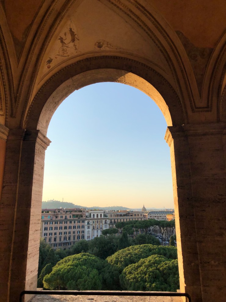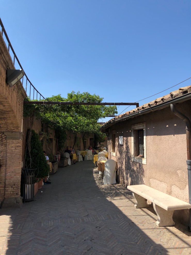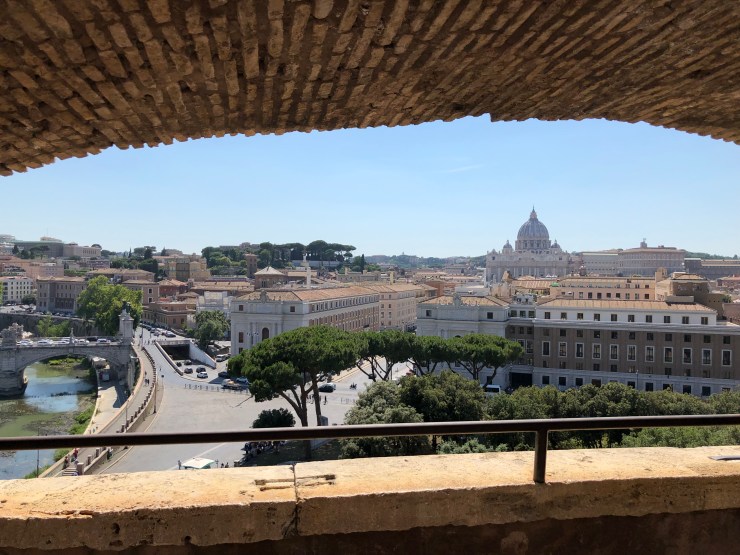 The castle winds up and around to a topmost viewing point. Throughout there are a lot of open “windows” offering a great view of the city and sometimes the Vatican. There is also a cafe near the top, with tables lining the walls, and some lovely ivy growing and spilling over.
